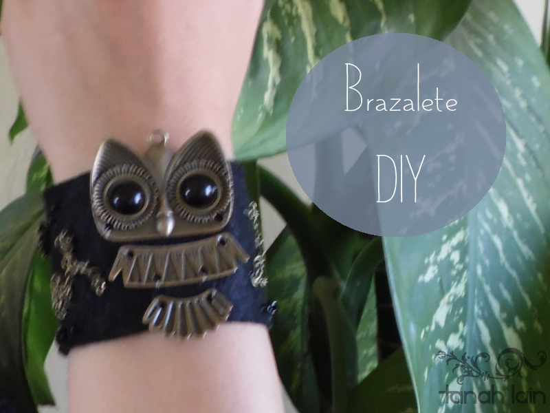 Ahora recortamos una tira de fieltro de lo que sea el diámetro de su muñeca más dos o tres centímetros para el cruce que se hace al cerrar. El alto del brazalete es opcional, en mi caso es de cinco centímetros. Si se fijan deje fuera algunas partes del dije (el búho era de cinco piezas y lo reduje a tres) para que cupiera dentro.