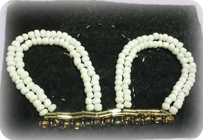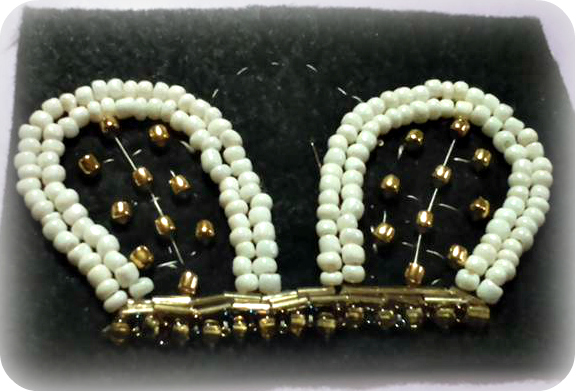 Le he puesto una perlita y una cuenta dorada en la parte más alta del trabajo pues me parecía que faltaba algo , no me terminaba de gustar como quedaba, esa simple acción le ha dado un puntito que me ha convencido.