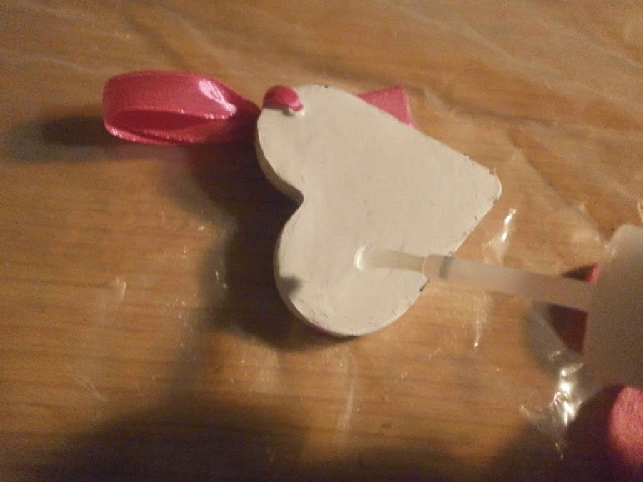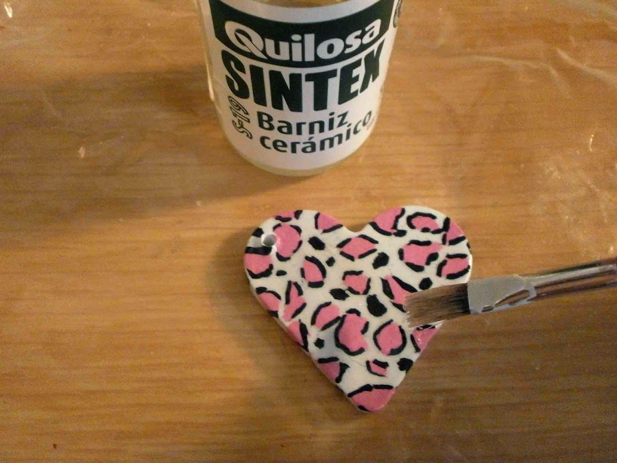 Cuando seque,(unos 15 minutos)le aplicamos el barniz cerámico y dejamos secar completamente , le ponemos un lazito.