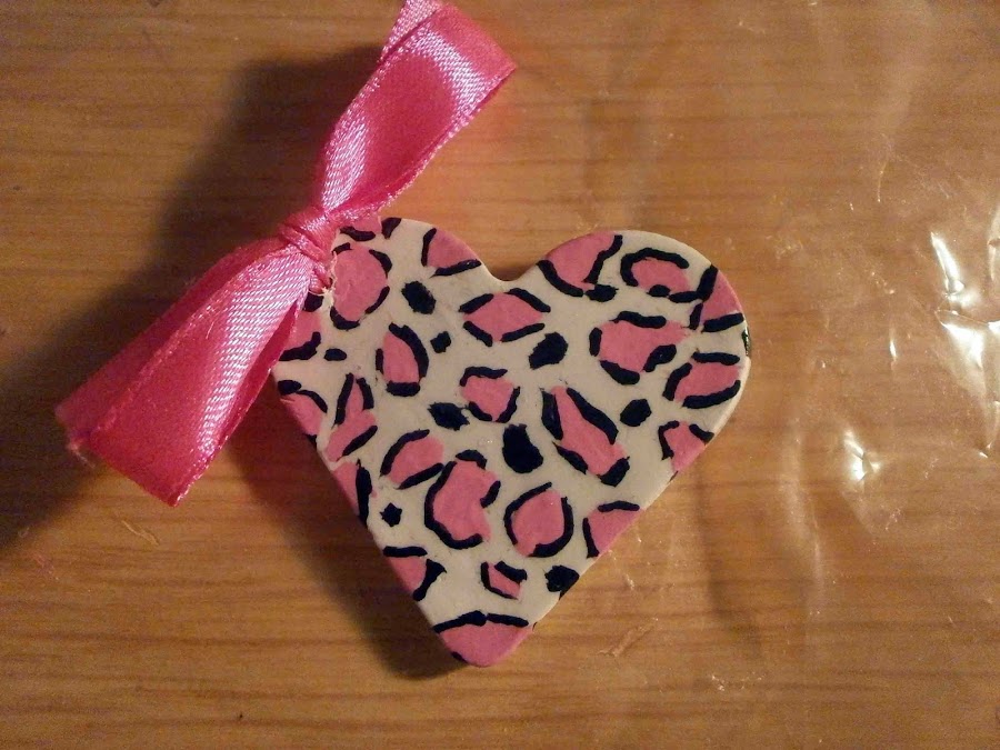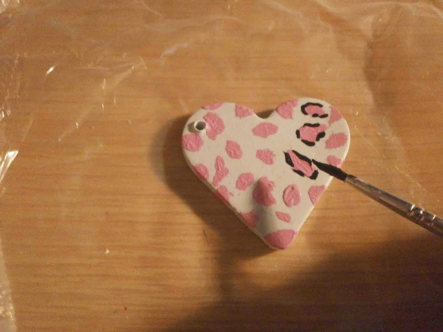 Materiales:Pasta de modelar, un rodillo, pegamento fuerte, un listón de lazo, un molde, fieltro, un enganche, un palillo, tijeras, pintura acrílica rosa y negra, dos pinceles uno mas fino que otro, barniz cerámico, un plástico y un lápiz.