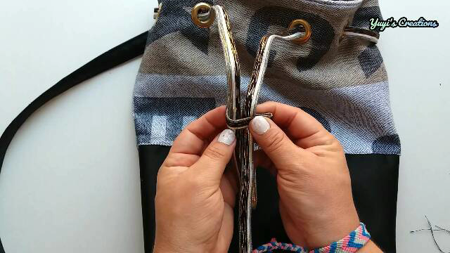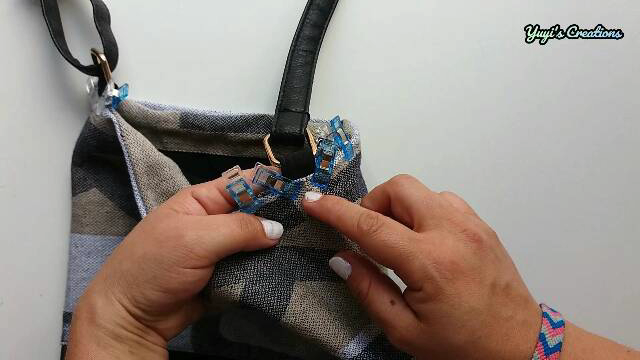 Hecho esto, damos la vuelta por uno de los agujeros que dejamos abiertos. Metemos el forro dentro del bolso y colocamos las asas a los lados del bolso, metiéndola por las aberturas que habíamos dejado, de esta forma: