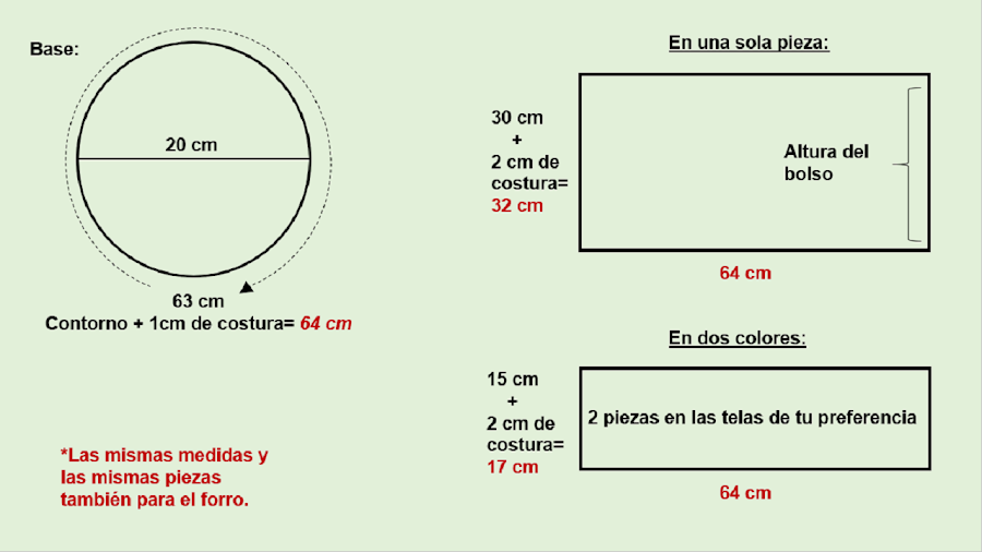 * El patrón para la base del bolso yo lo he hecho de 20 cm de diámetro y 63 cm de contorno más el margen de costura (total 64 cm), de la base sacaremos una pieza para el exterior y una para el forro.