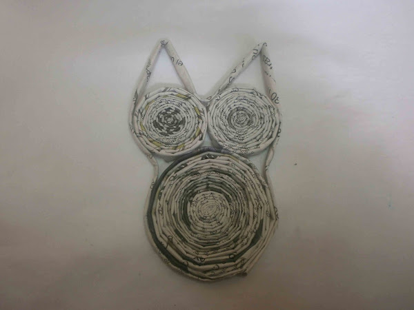 1 para las orejas y hacer el contorno del búho.Se hace el cuerpo enrollando los palitos y una vez acabado se incorpora otro palito pegando con silicona caliente y se continua hasta enroscar los cinco palitos de papel.
