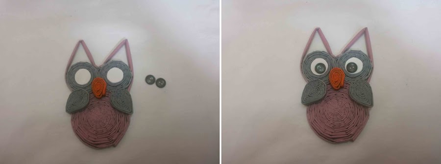 Se pegan los ojos al cuerpo y con un palito de papel se hace el contorno del búho y las orejas, pegando donde haga falta.