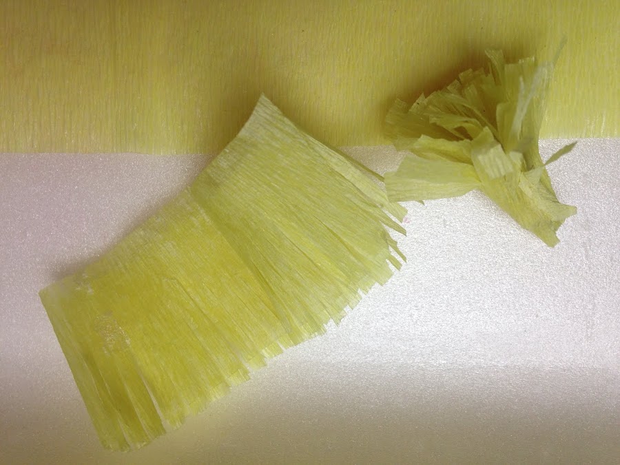 Para hacer las flores cortar tiras de papel crepe de color beige y verde. Aplicarle a cada tira una mano de barniz o silicona mezclada con alcohol. Dejar secar