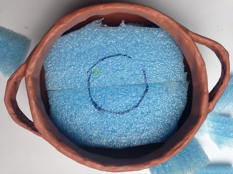 Coloque una espuma de embalaje dentro, dándole la forma dentro de la maceta para que tome todo el lugar. Luego marque el contorno que ocupa el pie del cactus y realicé un corte para poder introducirlo.