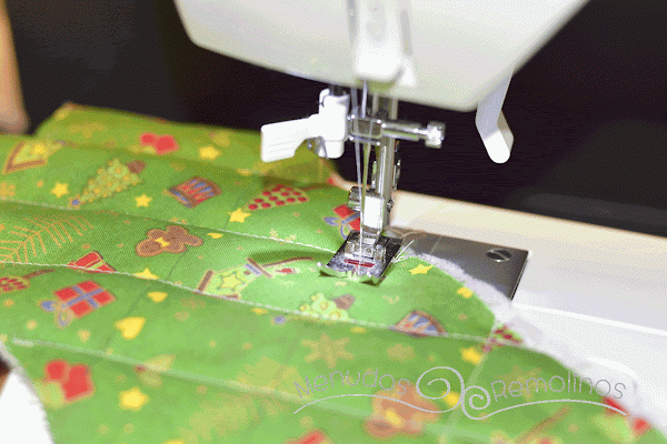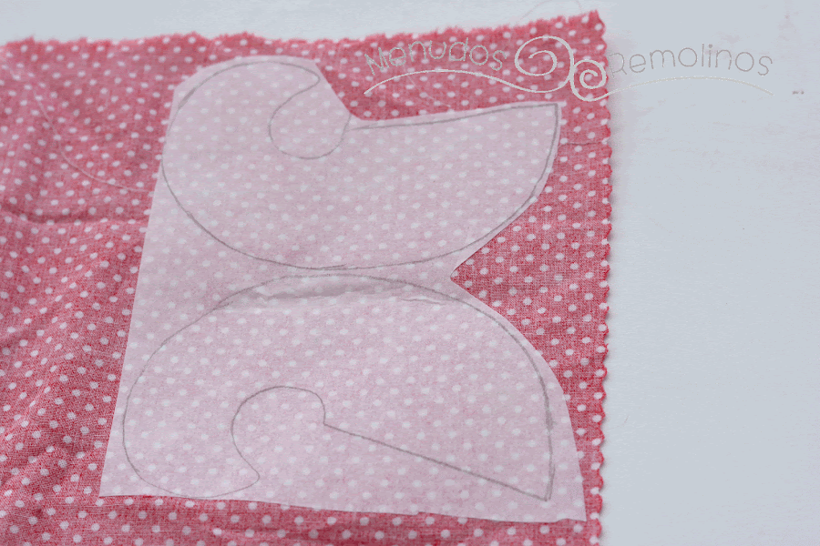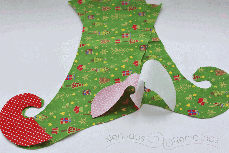 Al principio había pensado dejar las puntas en la misma tela navideña, pero probé con esta tela de lunares e hice las puntas con ella. Para ello calqué en papel de fiselina las puntas y luego con la plancha fijé el papel en la tela de lunares.