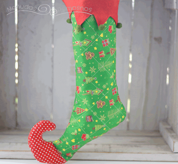 Como los diseños tipo bota de Navidad gigante, me parecían un poco sosos, me he decidido por hacer un patrón de calcetín con la punta "remolina" y así queda más de duende, más élfico. A mí me gusta más