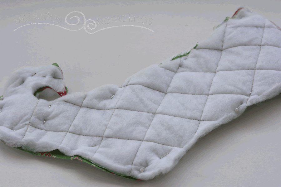 Necesitaremos 2 piezas de guata, dos piezas de cada cara del calcetín (cuidado con marcar derecho y revés para que queden enfrentadas), y las dos piezas dentadas que yo he hecho en fieltro.