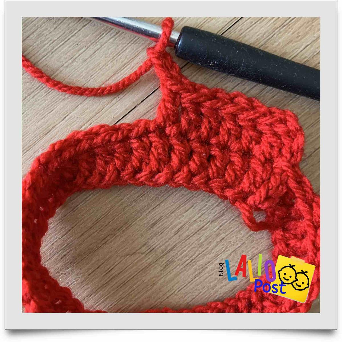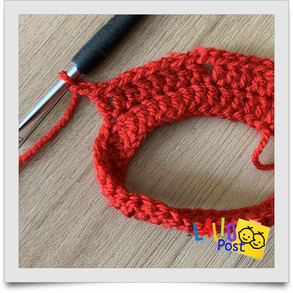 A partir de la tercera fila ya no tendremos que preocuparnos por estar contando los puntos. Simplemente, hacemos los puntos sencillos hasta que lleguemos a la zona donde tenemos que hacer los aumentos (primera imagen de la izquierda): donde tenemos la primera cadena hacemos una vareta sencilla (primera imagen de la derecha), después 2 cadenas (segunda imagen de la izquierda) y una vareta sencilla en el siguiente punto (segunda imagen de la derecha). Como ves, seguimos marcando la zona donde van los aumentos.Cierre del canesú