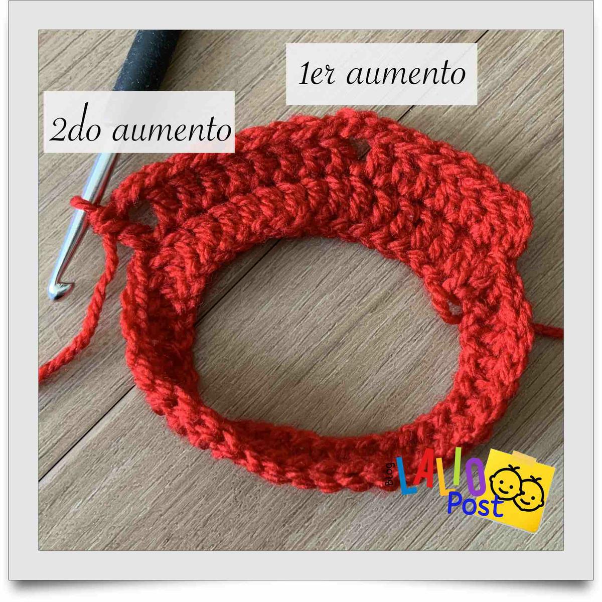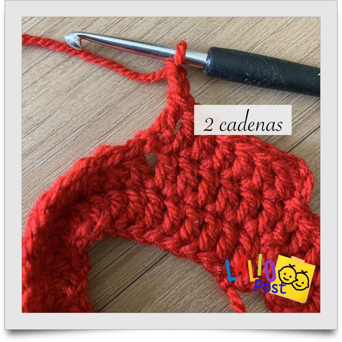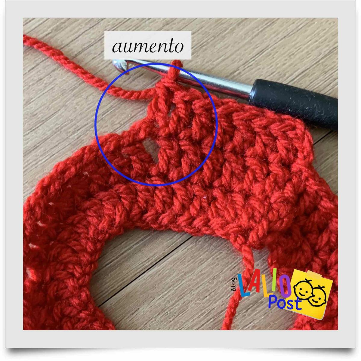 Comenzamos la segunda fila de nuestro canesú, dándole altura al punto que vayamos a utilizar y montamos las varetas necesarias para hacer el primer aumento (las que dice tu diagrama).El aumento se hace de la siguiente forma: hacemos dos cadenas y luego una vareta sencilla en el siguiente punto, tal como se muestra en las imágenes de abajo. Tenemos hecho nuestro primer aumento.