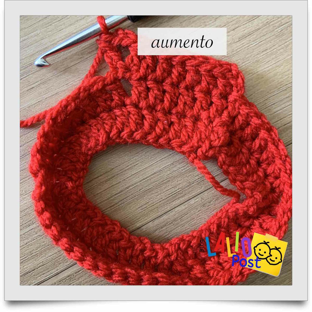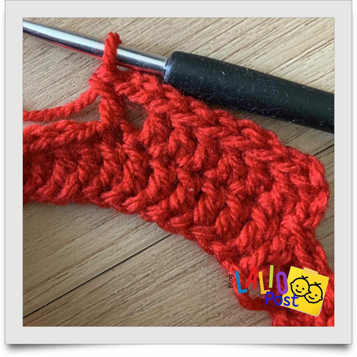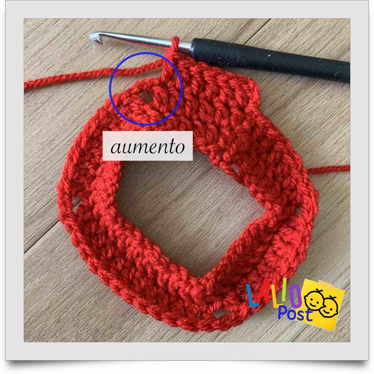 Comenzamos la segunda fila de nuestro canesú, dándole altura al punto que vayamos a utilizar y montamos las varetas necesarias para hacer el primer aumento (las que dice tu diagrama).El aumento se hace de la siguiente forma: hacemos dos cadenas y luego una vareta sencilla en el siguiente punto, tal como se muestra en las imágenes de abajo. Tenemos hecho nuestro primer aumento.