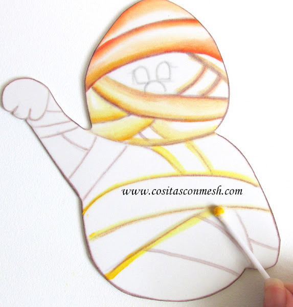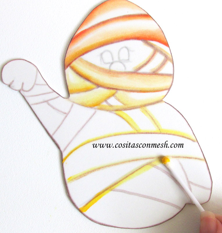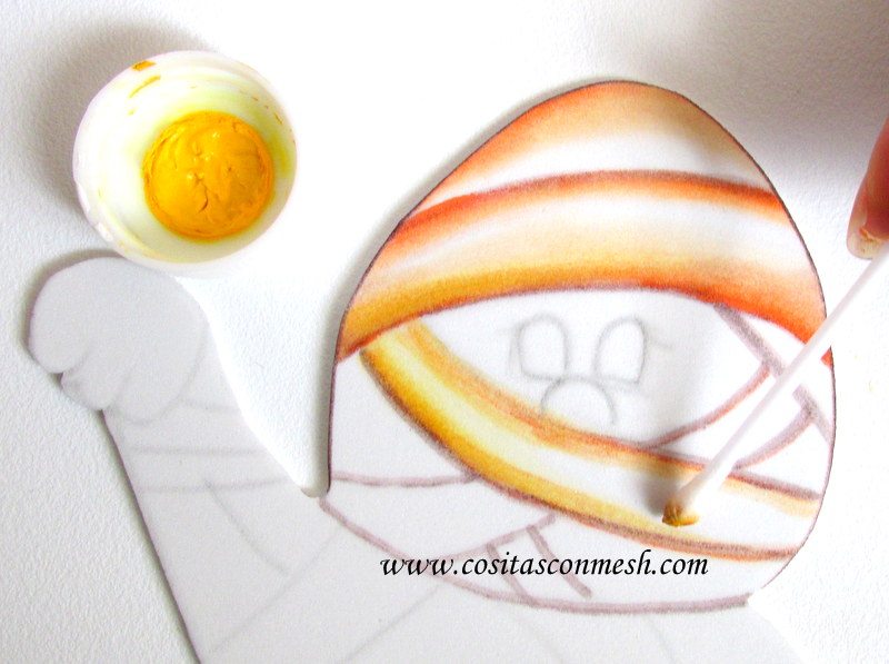 4.-Así continuare sombreando las vendas de la momia, pero como quiero que mi momia se vea más alegre, usare pintura amarilla con el hisopo, iré sombreando las otras vendas del cuerpo de la momia de halloween.