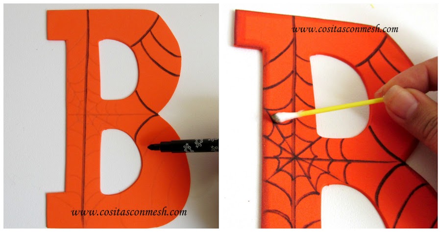 1.-Luego de transferir el molde del diseño de las letras, con un plumón negro o marrón, delinea el diseño de la telaraña que puse en la letra "B".