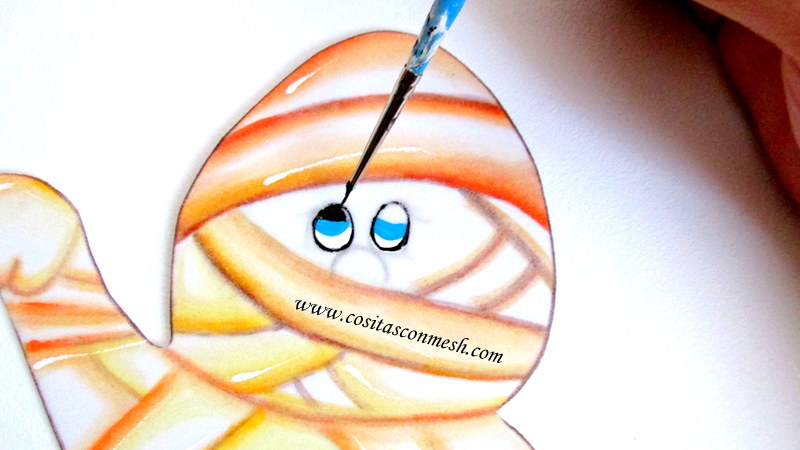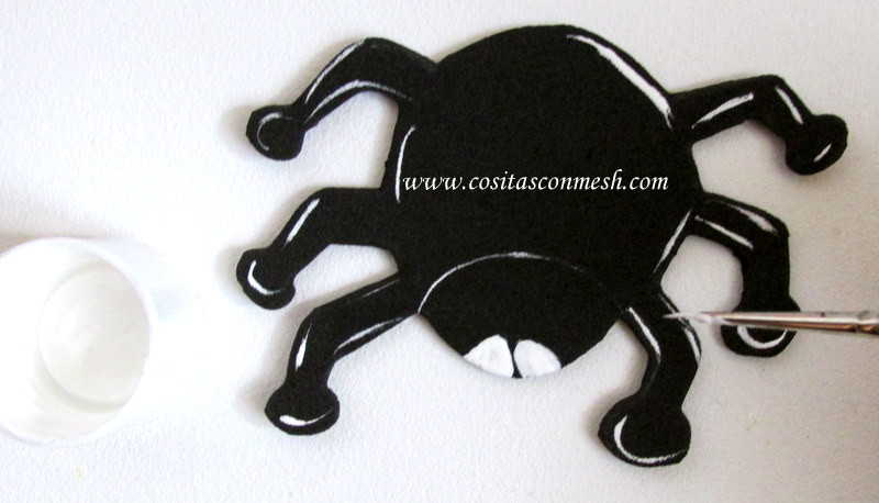 6.-Pintamos unas lineas blancas en la araña, pintamos los ojos de blanco, luego añadimos unos puntitos de negro y listo.