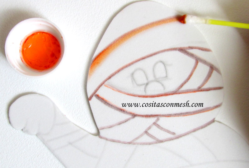 3.-Para darle sombra a las vendas usare un hisopo con el cual tomare solo un poquitito de pintura naranja y pasare sobre el delineado que ya hice, difuminare ese trazo con el mismo hisopo.