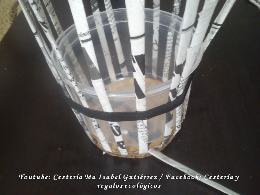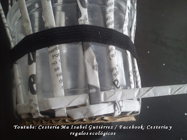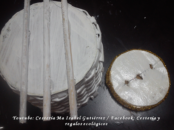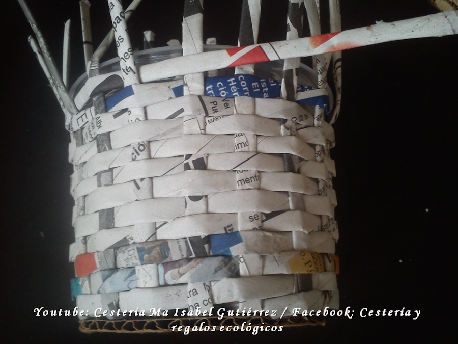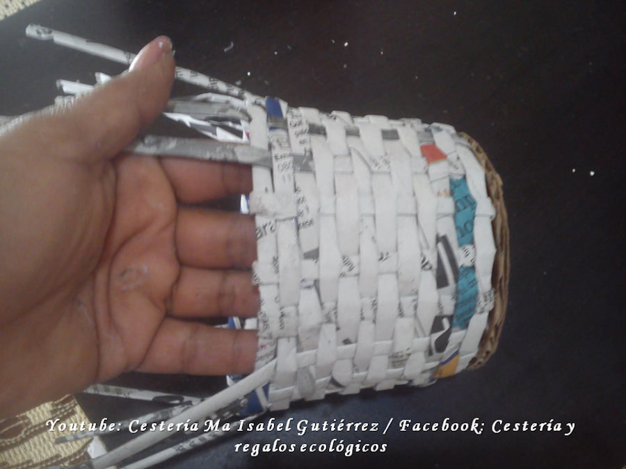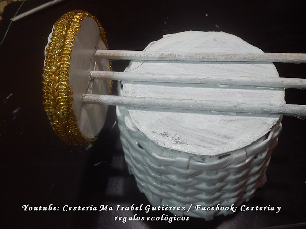 Rematamos las varillas verticales que quedaron de una manera muy sencilla, las verticales que quedan hacia adentro del tejido, cortamos un poquito, doblamos hacia afuera, ponemos una gota de pegamento y escondemos entre el tejido exterior... con las verticales que quedaron hacia fuera hacemos lo mismo, pero las escondemos en el tejido interior, o sea, por dentro del canasto...