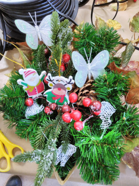 La primera lleva una base de ramas recicladas de un árbol de navidad viejo, cuentas plateadas de un collar de #laniña y bolitas rojas, piñas y estrellas de madera de Leroy Merlin.