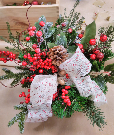 La siguiente la rellené con tiras de papel (hace un efecto acolchado más bonito que haciéndolo bolas) y encima puse una tela pegándola a los bordes con silicona. Mezclé dos tipos de adornos; en la parte superior vegetal y en la inferior navideños, con copos de nieve y una estrella de madera, cascabeles y piñas blancas y plateadas, también de Leroy Merlin: