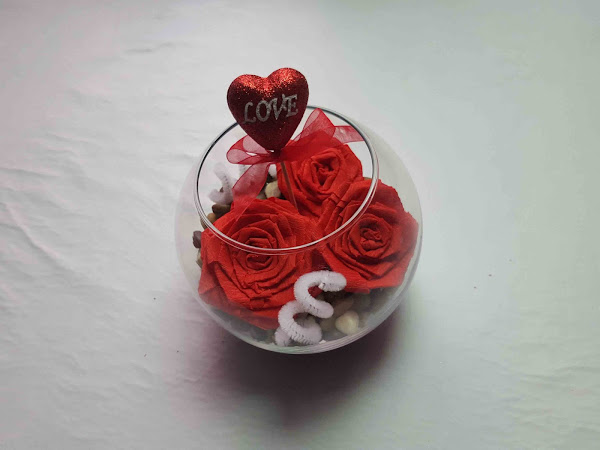 Por último sólo hay que poner dentro del recipiente las flores y el limpiapipas. Le puedes añadir también un corazón.