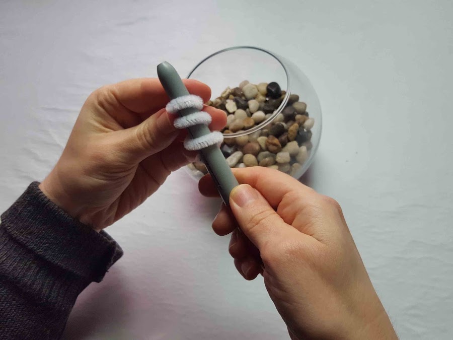 Se ponen dentro del recipiente de cristal las piedritas. Se corta a la mitad el limpiapipas y se le da forma de muelle con la ayuda de un bolígrafo o rotulador.