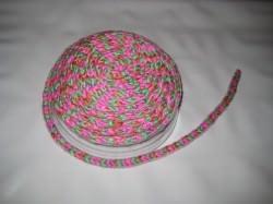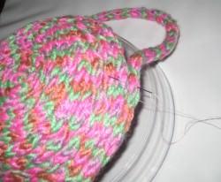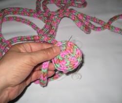 Vamos dando vueltas al molde mientras seguimos cosiendo cada vuelta con la anterior, hasta que se nos termine el cordón que hemos tejido.