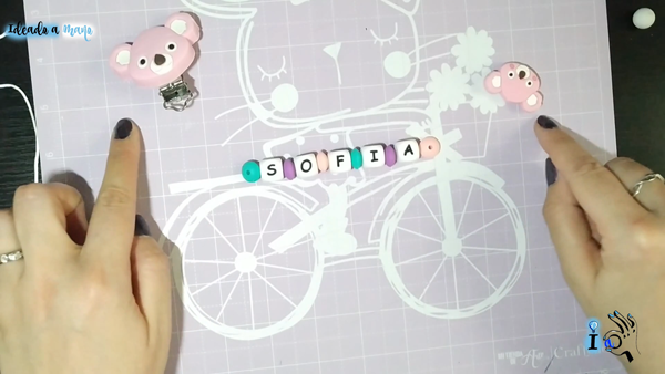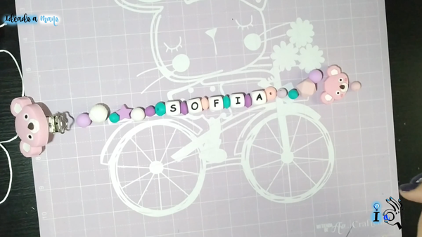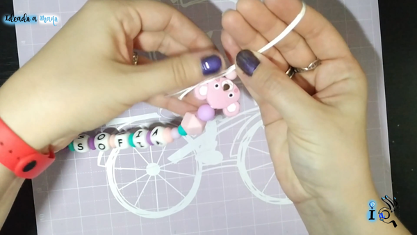 Luego colocamos el resto de piezas que queramos poner en el chupetero, porque solo con el nombre queda un poco corto normalmente, de manera que colocamos en ambos extremos más piezas alternando colores y tamaños, hasta alcanzar la longitud deseada. Importante es que si tenemos una pieza como la de la cabecita del koala que yo tengo esa no puede ir en la punta, colocaremos justo tras ella una bolita o pieza más pequeña para poder anudar en ella luego el cordón.