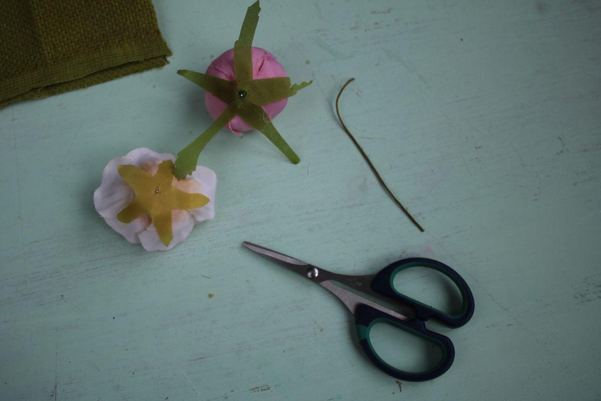 Para fijar definitivamente las flores usaremos aguja e hilo. No hace falta que sepamos coser. Simplemente será nuestra herramienta para que las flores se mantengan seguras y no se despeguen.