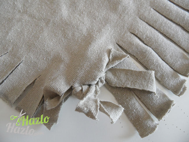 Hay que hacerlo con todos los flecos por todos los bordes de los recortes de camiseta. Esto irá cerrando y dando forma al cojín.