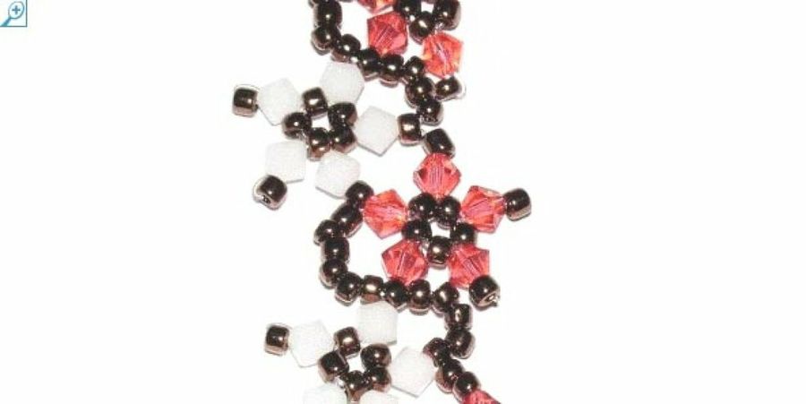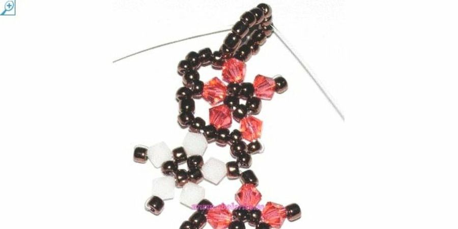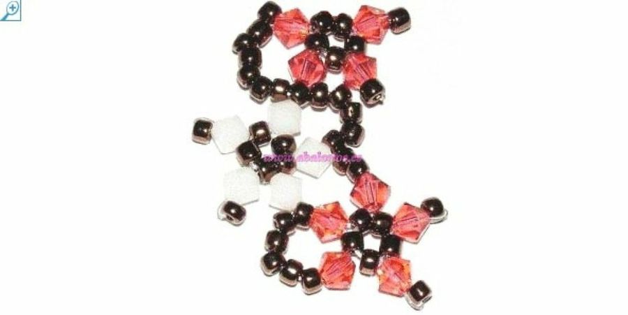 Enfilamos tupi, seis rocallas, tupi y pasamos el hilo por la rocalla de la que parte y por la siguiente.