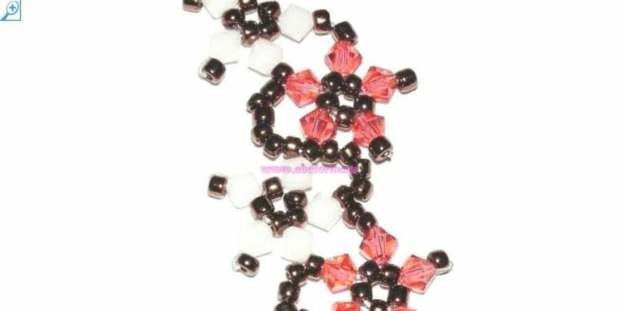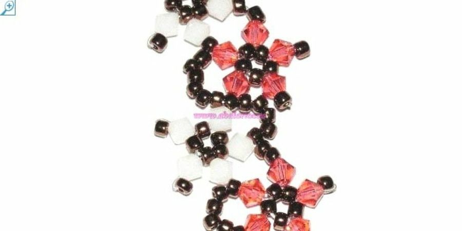 En el hilo de la izquierda enfilamos seis rocallas y un tupi padparadscha, en el otro hilo enfilamos un tupi padparadscha. Cruzamos los hilos por una rocalla y con uno de los hilos volvemos a hacer el centro de la siguiente flor, para ello enfilamos cuatrorocallas y pasamos el hilo por la rocalla de la que sale el hilo.
