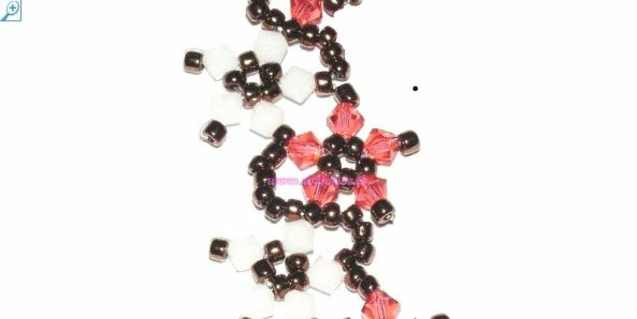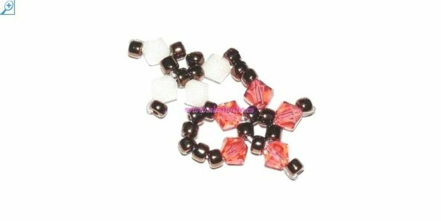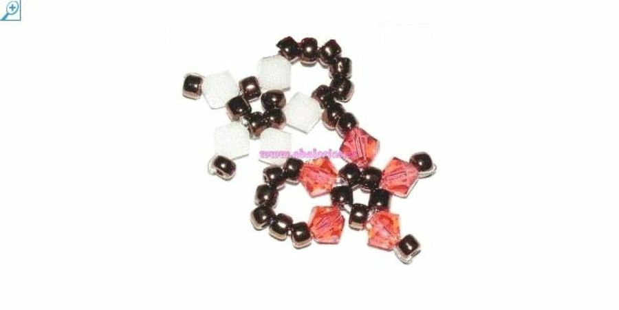 En el hilo que sale del tupi enfilamos una rocalla y un tupi blanco, en el otro hilo enfilamos tupi padparadscha, dos rocallas, tupi blanco y cruzamos los hilos por una rocalla. Nuevamente hacemos el circulo interno de la nueva flor, enfilando cuatro rocallas en un hilo y pasando el hilo por la rocalla de la que sale el hilo.