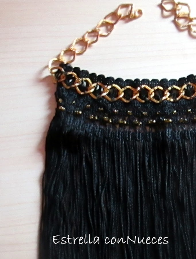 Pues tan simple como, enhebrar la aguja con el hilo, poner la cadena sobre los flecos... e ir cosiendo! Yo le cosi después unas cuentas para darle mas vidilla! Para acabar le ponemos el broche... y Listo! Fácil y sencillo no?