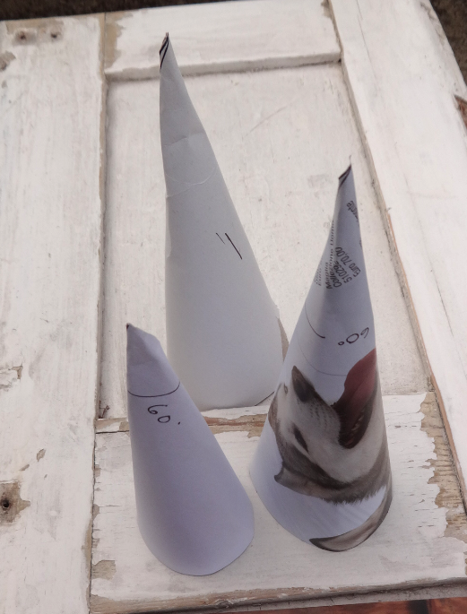 Según la altura que desees dar al cono, es la medida que debes dar de longitud en el molde mas 1 cm, para este cono de 60 grados, ya que al cerrar el cono se baja 1 cm de altura.