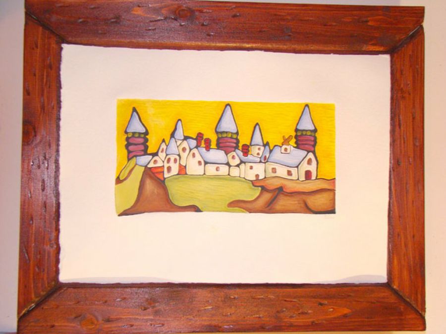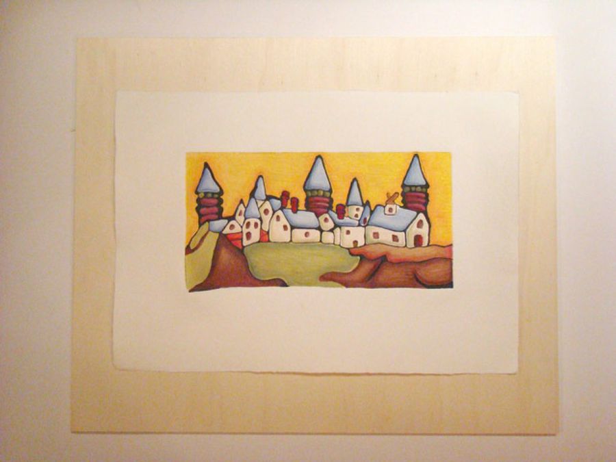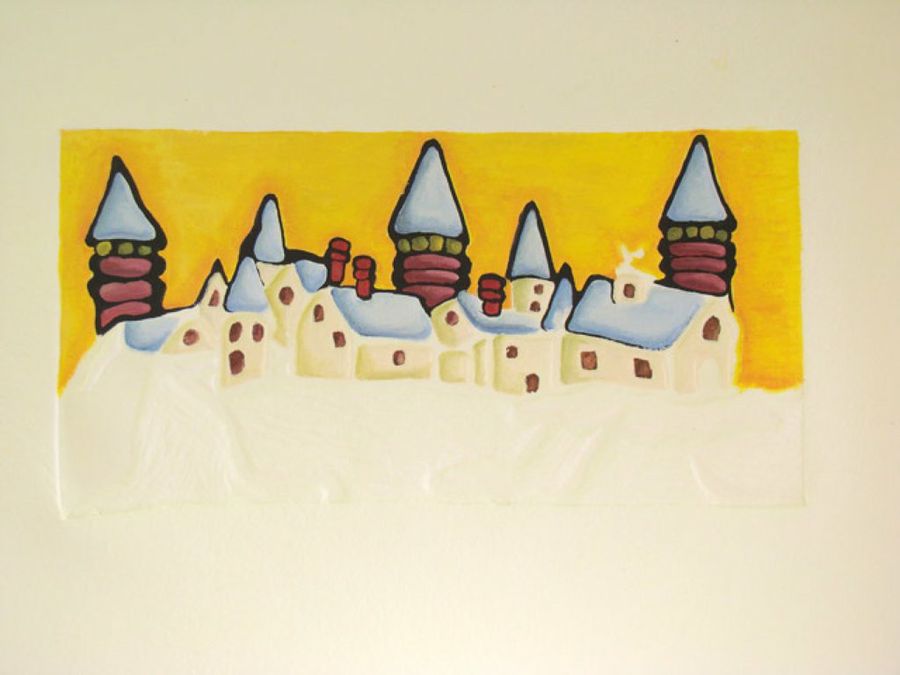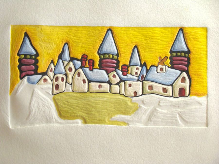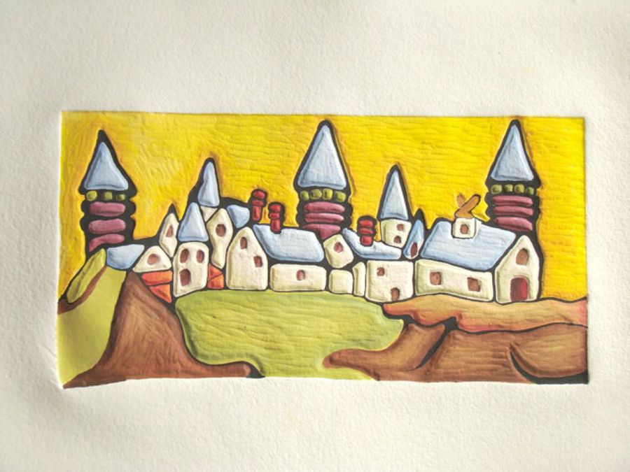 Poco a poco iremos viendo que el dibujo se convierte en un paisaje lleno de colores y que puede variar la gama cromática, eso sólo depende del gusto del creador. Además, a medida que vayamos terminando el dibujo podremos ver un detalle del cuadro donde se aprecia el relieve que ha producido la plancha de linóleo, mezclado con el degradado de los colores.
