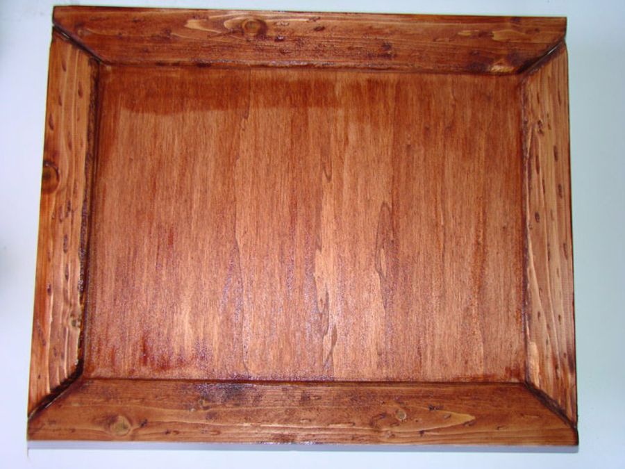 Con cola blanca pegaremos los laterales al soporte y ejerceremos presión. Cuando el pegamento esté lo suficientemente seco, aplicaremos barniz con un tinte para que la madera coja color. Se aplica con una brocha que tenga el pelo suave una o varias veces, dependiendo del color que busquemos.