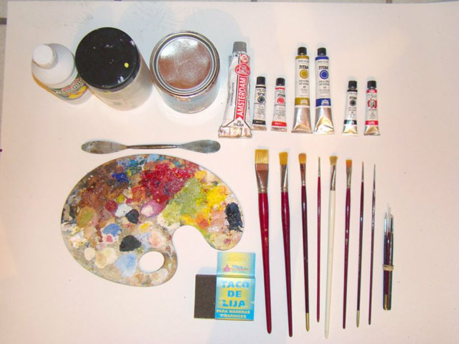Utilizaremos óleos de diferentes colores que los mezclaremos sobre una paleta. No es necesario utilizar muchos colores, es suficiente con tener los tonos básicos: amarillo, magenta, cian, blanco y negro. Con estos cinco colores podemos obtener todos los demás. No obstante, en el caso de que queramos diluir la pintura necesitaremos un disolvente, como puede ser el aguarrás.