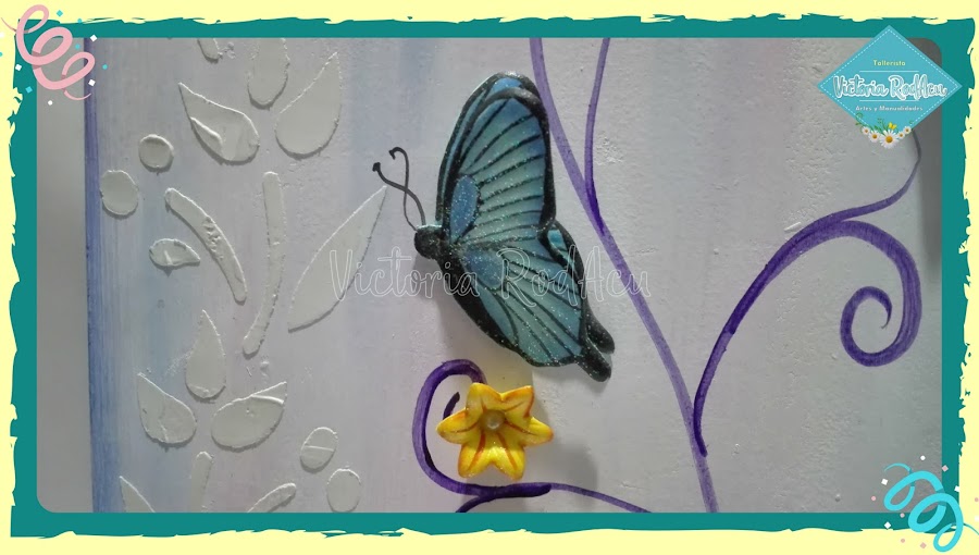 Antes de pegar las mariposas recuerda hacer un fondo texturizado usando la pasta de relieve y el stencil.