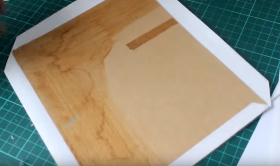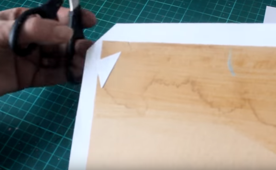 Para forrar el cartón vamos a recortar las esquinas en diagonal dejando unos milímetros de papel entre el vértice del cartón y el corte.