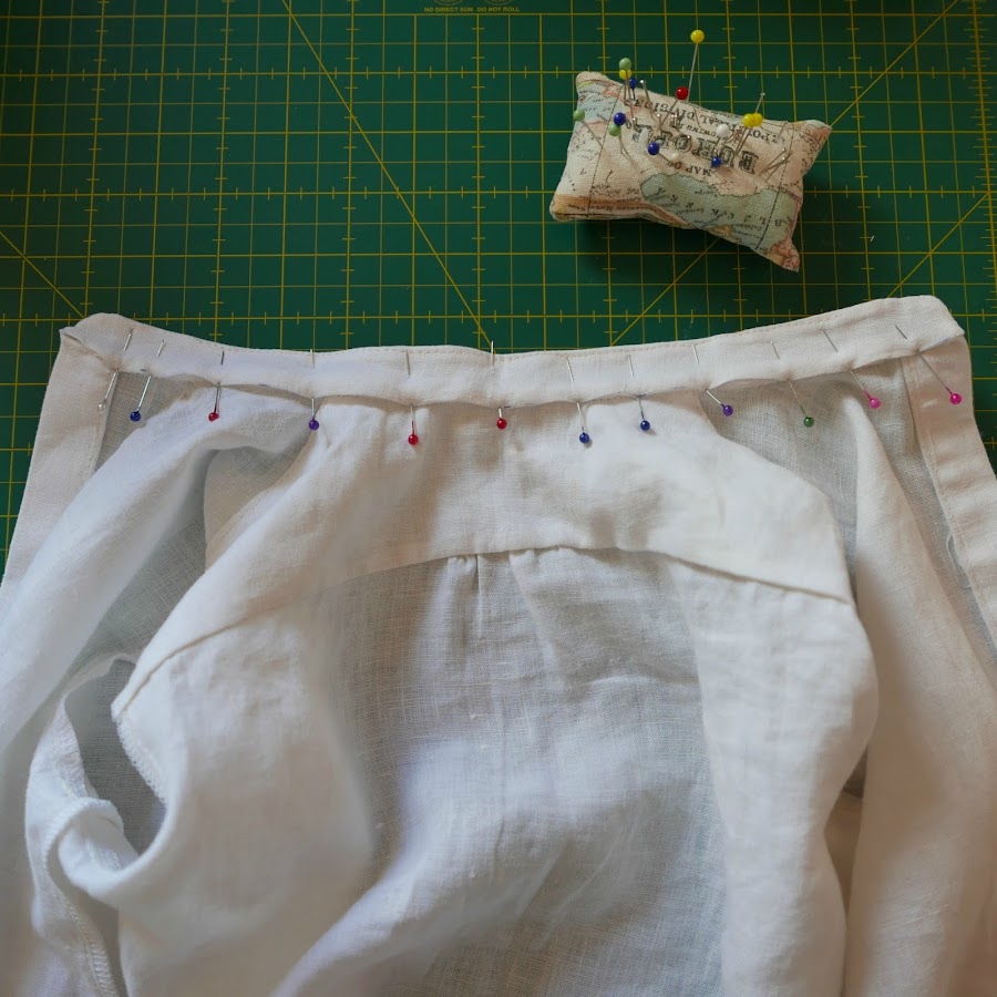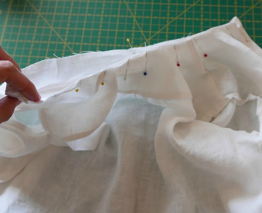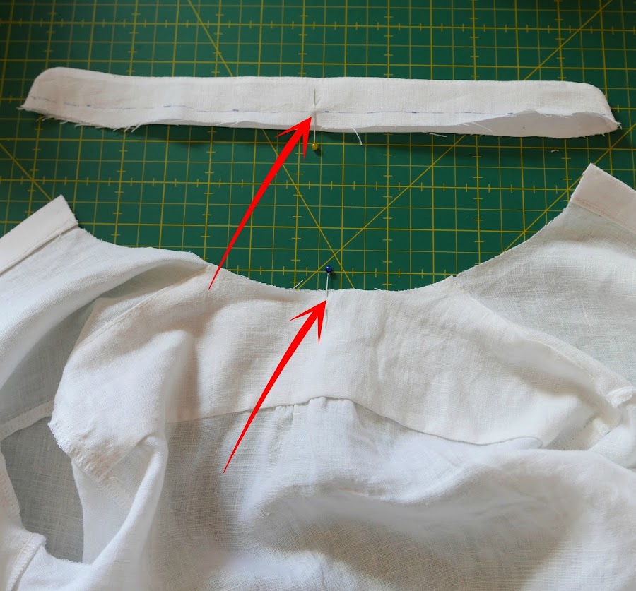Cuando tengamos la entretela unida a la pieza exterior del cuello, unimos la otra parte del cuello con alfileres.