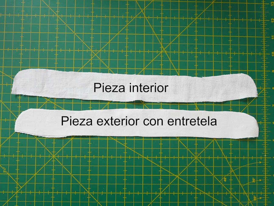 Comenzamos por cortar las piezas del cuello. Cortaremos dos piezas iguales de tela y una pieza en entretela.