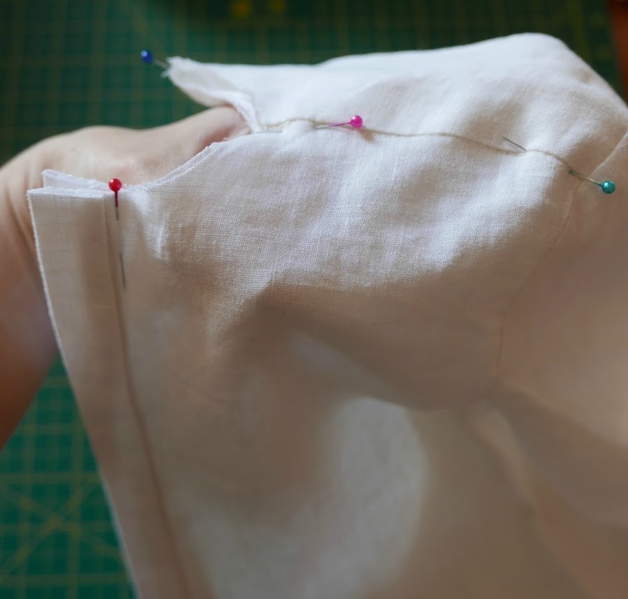 Ahora vamos a coser la parte interior. Primero doblamos la parte interior hacia adentro y la sujetamos con alfileres: