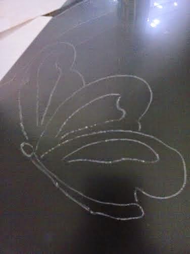 Antes de colocar las mariposas, dibujé unas volutas que luego rellene con color negro y crear el efecto de ramas o tallos de flores en el que se posarán las mariposas