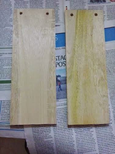 Tenemos dos tablones de madera, le hacemos los huecos en donde decidamos que se van a colgar, los lijamos bien hasta quedar prolijos.