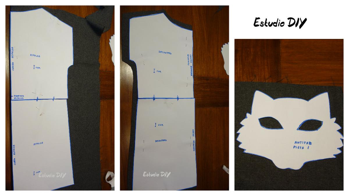 El primer paso consistirá en cortas todas las piezas que componen nuestro disfraz. Para la mayoría de las piezas no es necesario dejar margen de costura, a excepción de hombros, centro espalda y costados del vestido, así como lateral de manoplas. Para lo demás, simplemente situar el patrón en el tejido, marcar con jaboncillo y recortar por la señal.Paso nº2 Confección o Pegado.
