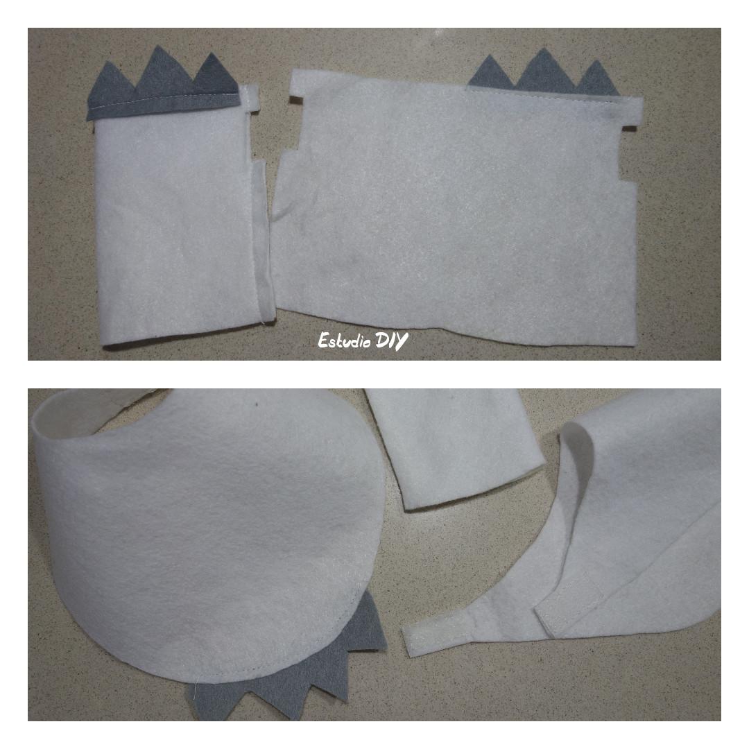 Para realizar las manoplas o cubre zapatos, cosemos o pegamos las garras a las mismas. Seguidamente, coser un trozo de velcro en los extremos del cubre zapato y pasar un pespunte por el lateral de la manopla, dejando libre el hueco para pasar el dedo pulgar.