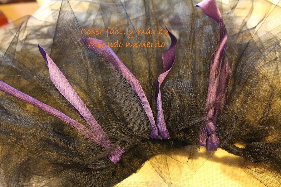 Así va quedando la falda después de anudar las tiras de tul negras y añadir unas cintas hechas con rasete morado. Luego colocaremos unos murciélagos que podemos pegar con pegamento textil.