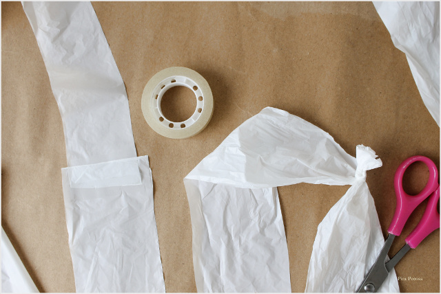 # Paso 4: Enrolla alrededor suyo las tiras de plástico, sin apretar. Te recomiendo que a medida que lo vas haciendo, las pegues unas a otras con celo para que se mantengan en su sitio, porque al contrario de lo que ocurre con las de tela no se sujetan una a otra, sino que resbalan.