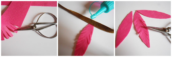 Hacer la forma de una pluma y recortarlo, dar unos pequeños cortes en el contorno y coser o pegar a una cinta de 40 cm de largo y 1 cm de ancho, con esto ya tenemos un collar.