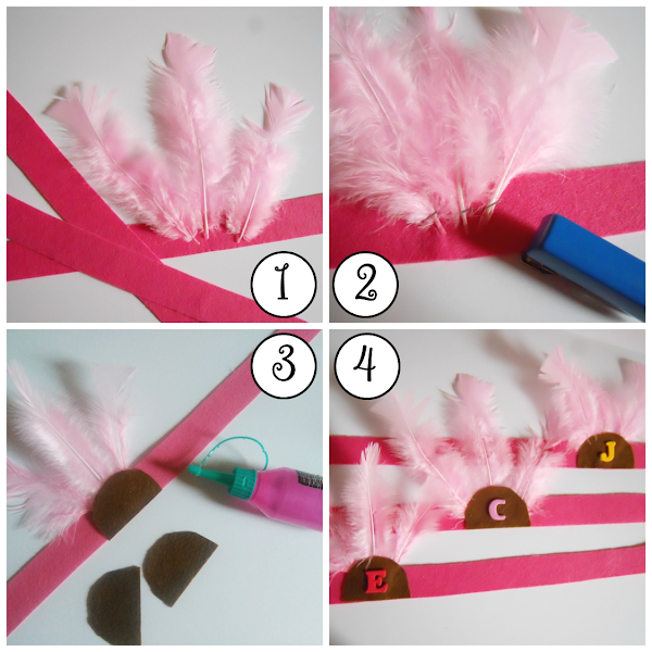En el centro de esta cinta añadir las plumas, yo en esta corona he puesto tres y las he grapado, pero también se pueden coser o pegar.